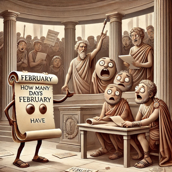 당시 로마인들은 짝수는 불길한 숫자라고 믿었기 때문에 모든 달을 홀수로 만들려고 했어. 그런데 355일을 홀수로만 맞추다 보니, 2월이 어쩔 수 없이 28일(짝수)이 되고 말았어.