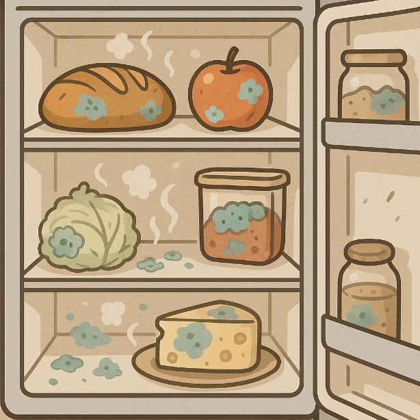 우리는 흔히 냉장고에 음식을 넣어두면 "안 상할 거야"라고 생각해. 근데 어느 날 보면 빵에 푸른 곰팡이, 과일에 하얀 털이 자라 있어.